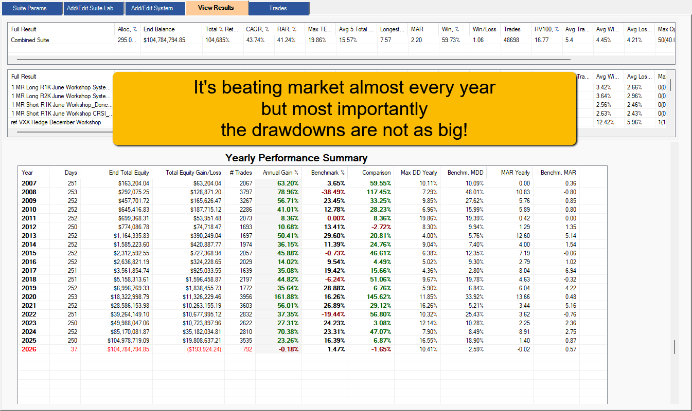 Wouldn’t it be nice to have a suite of systems which can work for you in all kinds of market conditions, beat the market (S&P 500 in this case), and at the same time generate a lot of profits?